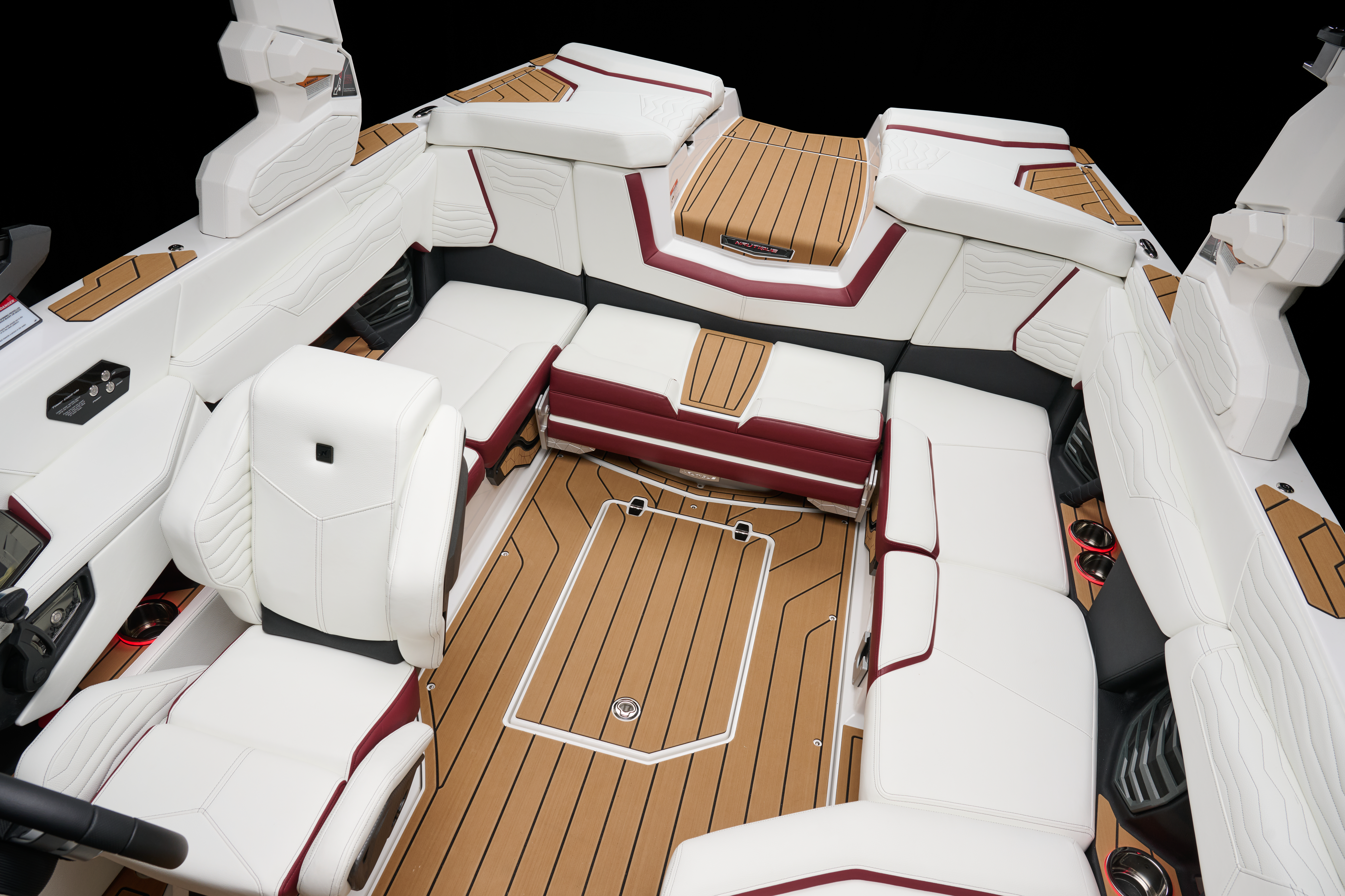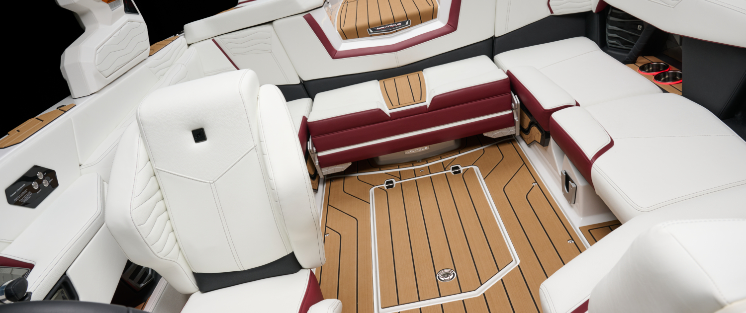 The G21 takes the asymmetrical design that Nautique pioneered and made it even better. Clear visibility of the water and the LINC Panoray touchscreen are evident, while also keeping everything the driver needs within reach. The G21 dashboard has a place to keep your drain plug when your boat is out of the water and a large open dash area ideal for hats and other accessories. Adjacent to the steering wheel, the new engine start and stop button paired with the reconfigured Hot Keys on the Helm Command act as a keypad to securely power your G21 on and of