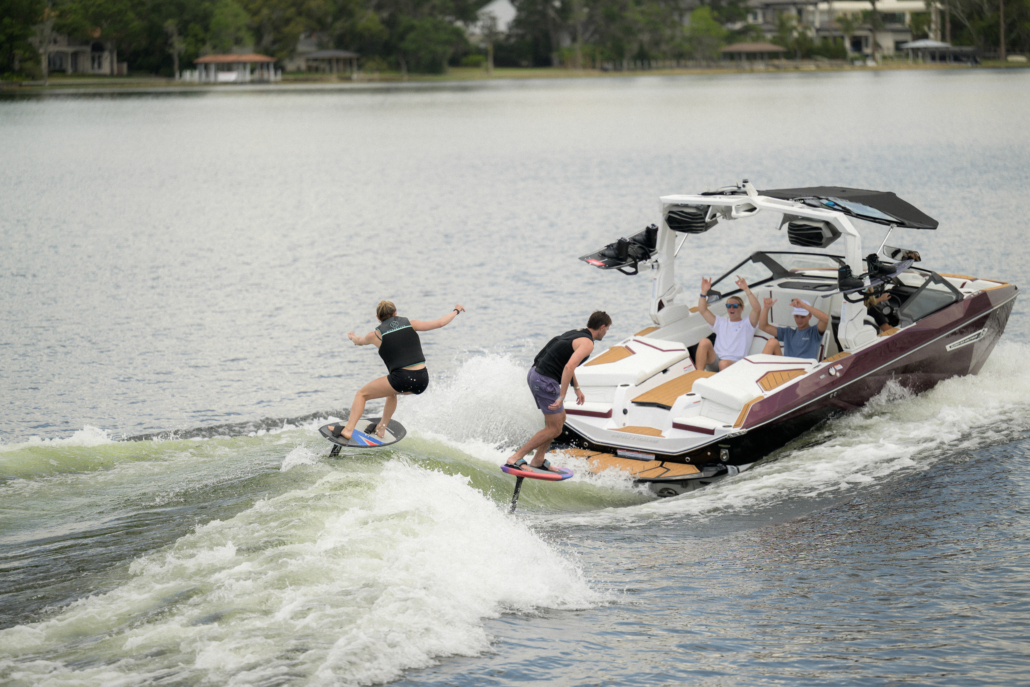 The Super Air Nautique G21 incorporates the Nautique Surf System (NSS) with WAVEPLATE® technology. Integrated right into the hull, the WAVEPLATE on the G21 is designed to work in concert with the hull to provide the best, most-configurable surf waves you could desire. The WAVEPLATE extends outward and down from the transom to redirect the flow of water forming the perfect, customizable wave on either side of the G21. Since the WAVEPLATE extends out on either side of the hull, it allows surfers to switch which side of the boat they’re surfing instantly and without the need to change up ballast or shift people in the boat. With multiple settings, the NSS also permits you to adjust the shape of your wave while you surf.